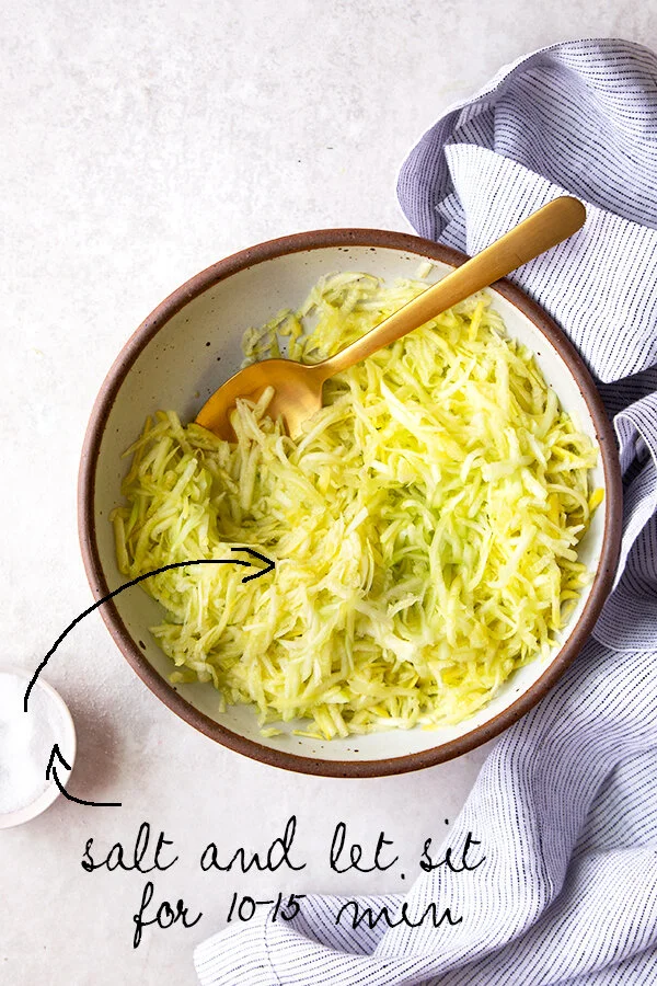 1. Peel the zucchini and grate them on the large wholes of a box grater (yields about 2-2.5 cups of shreds). Place grated zucchini in a large mixing bowl, add the sea salt and mix really well using your hands until the zucchini start feeling wet to the touch. Leave for 10-15 minutes to allow the juices to release.